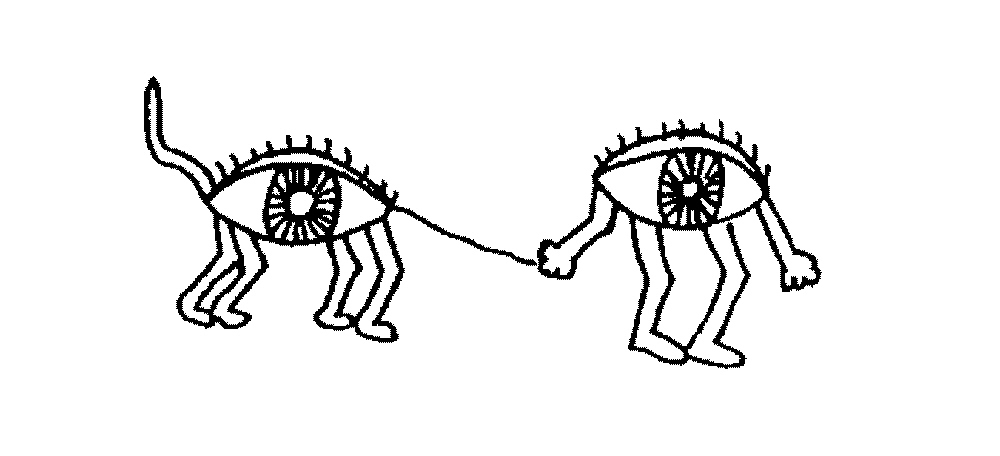 In bpNichol’s writing class, I doodled as I listened. One day I drew an image of two eyes. The right with a single pair of legs, the left with two pairs. The first eye held the other on a leash. A human eye leading a dog eye. I’ve begun to think of this image, over the years, as my logo. I like its tricky wink to hierarchy, as if one eye could be led by another, as if it could be a pet. What exactly is going on here? Is it a trompe d’oeil, a visual pun, or something from a folk tale? And here it is at the end of this essay as if it always belonged here, as if the metaphor of stereoscopic eyes on the past had already literally been embodied by me forty years ago. Is this the revisioning of history, something just to the left, just to the right of the truth and yet somehow connected, relational? The I of the present, the Thou of the past.